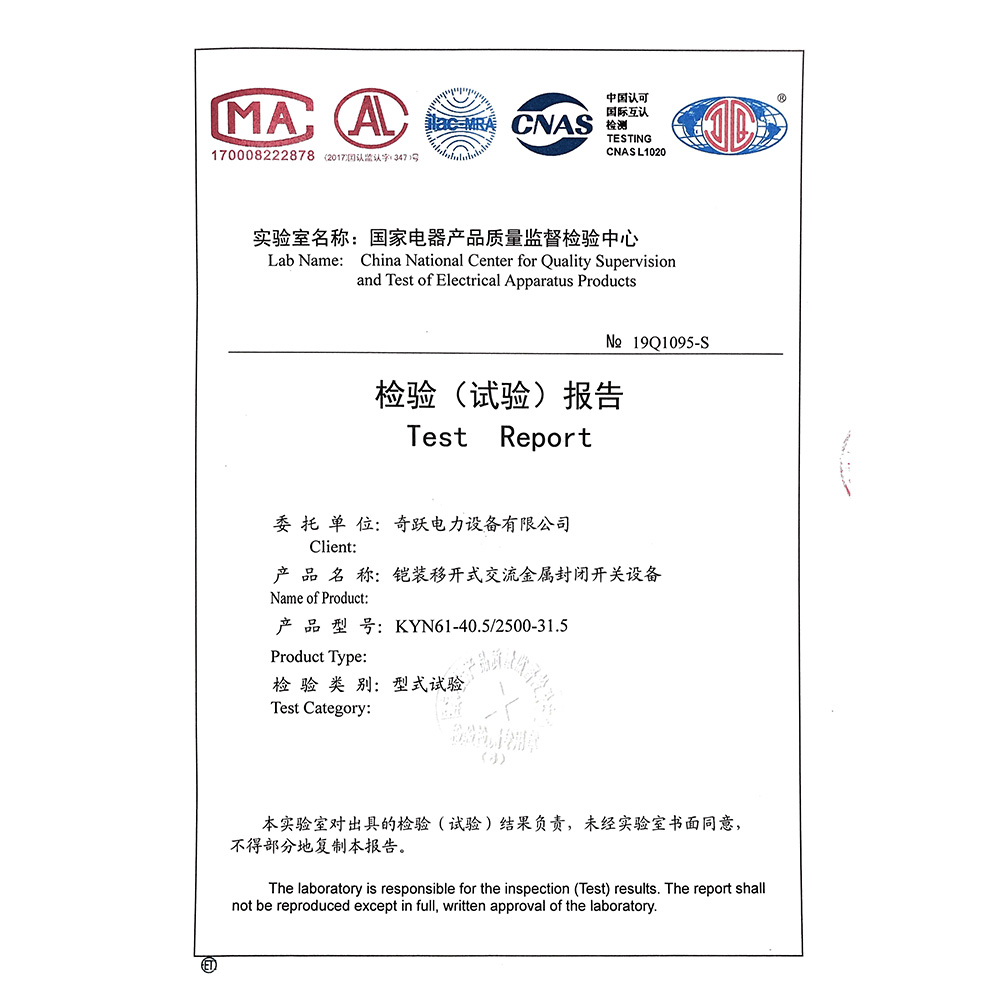 KYN61-40.5/2500-31.5鎧裝移開式交流金屬封閉開關設備 檢驗報告