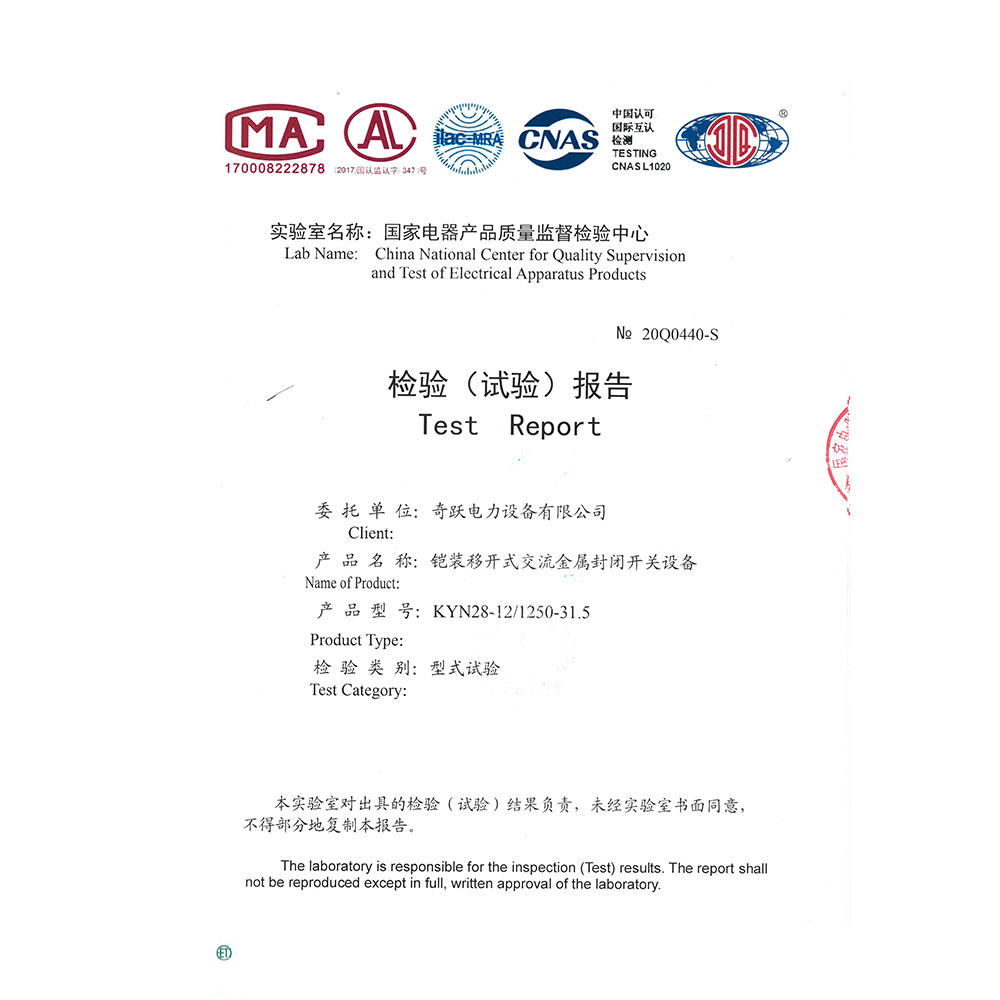 KYN28-12/1250-31.5鎧裝移開式交流金屬封閉開關設備 檢驗報告