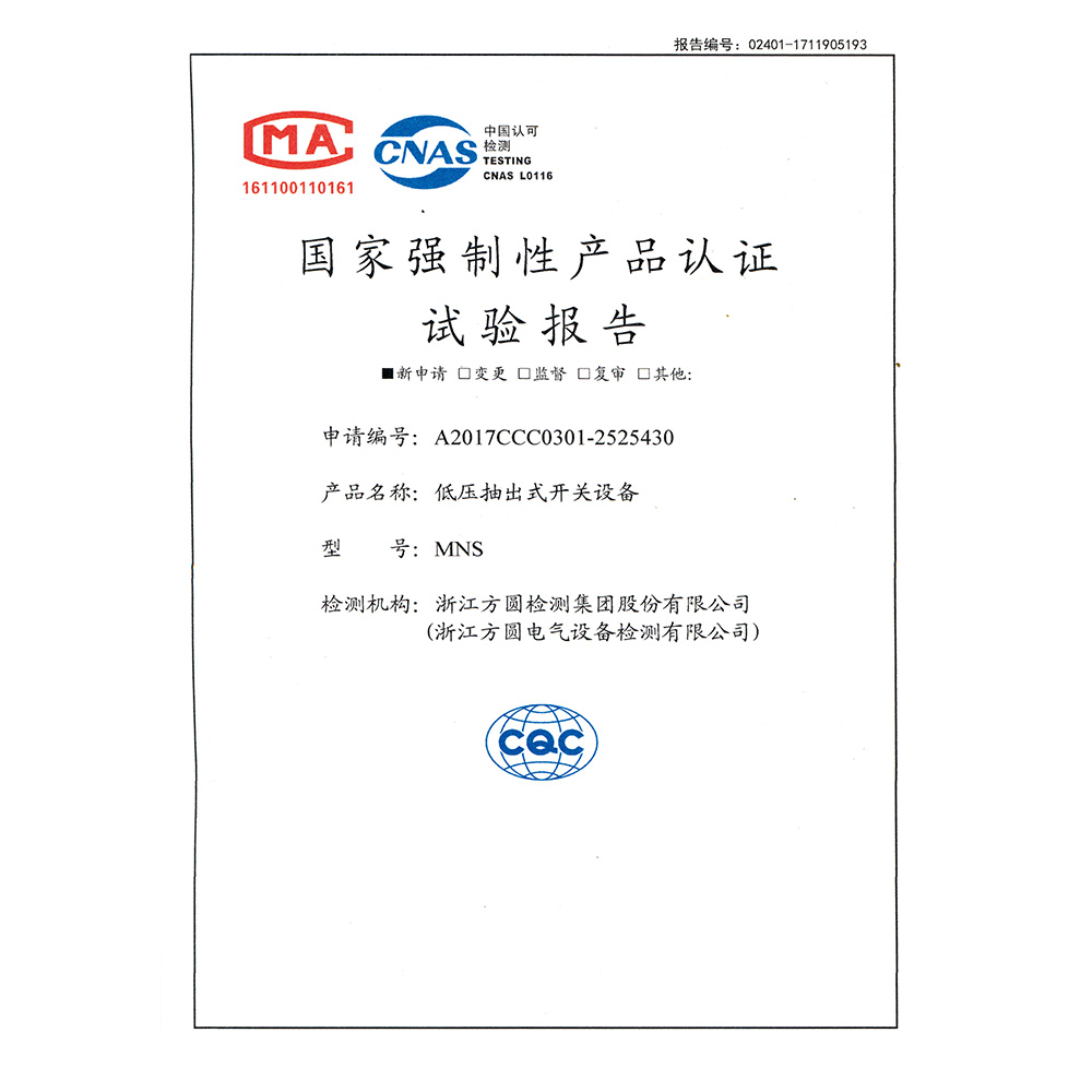 MNS低壓抽出式開關設備 檢驗報告